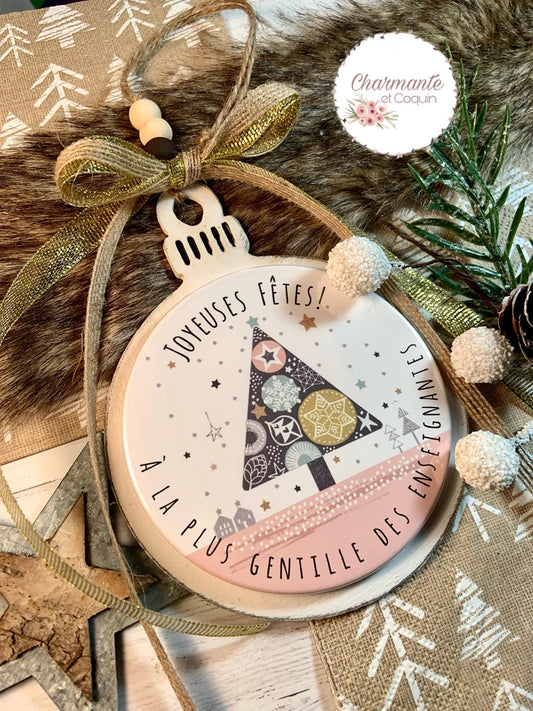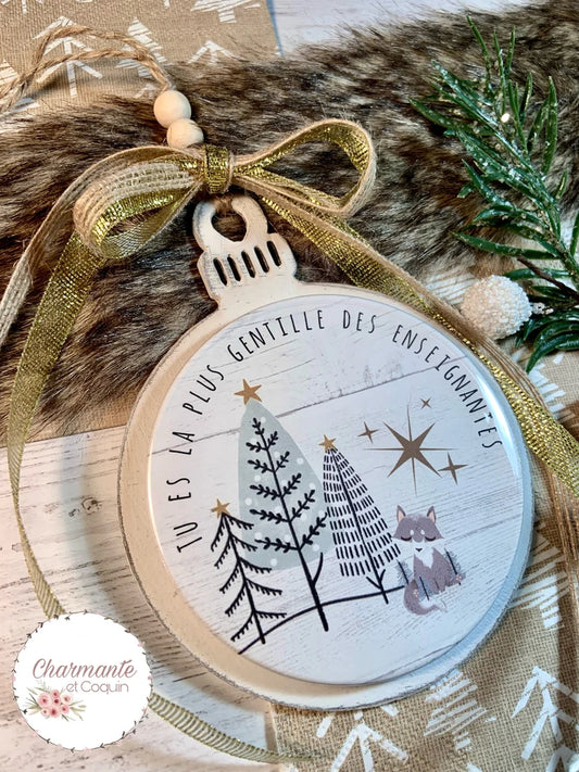 Boule de Noël en bois personnalisée de style rustique chic, cadeau pour enseignante