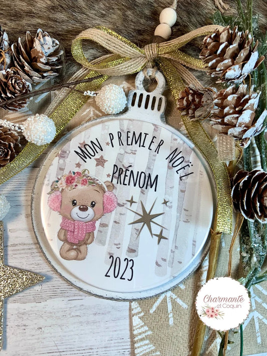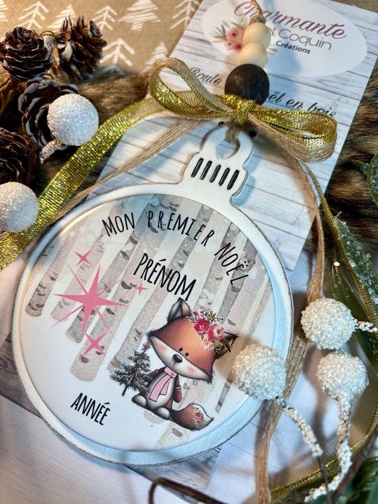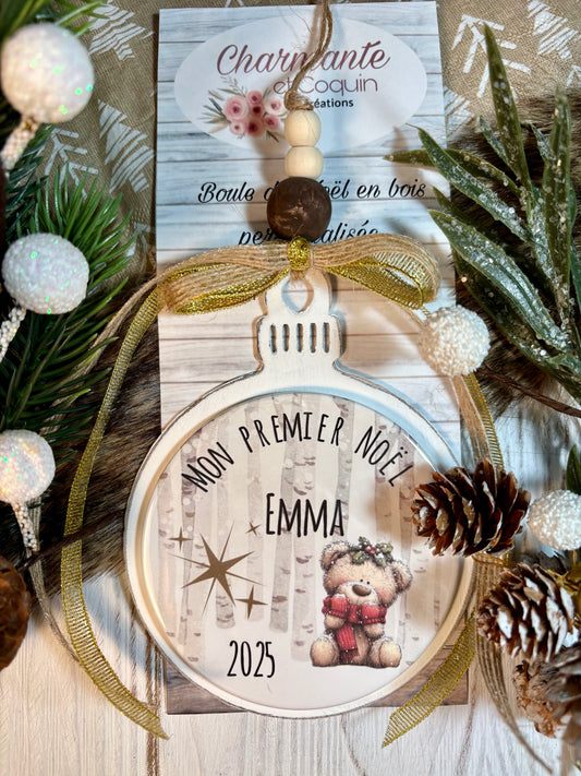 Boule de Noël en bois personnalisé de style rustique chic avec charmant motif du temps des fêtes