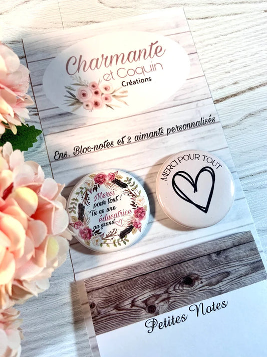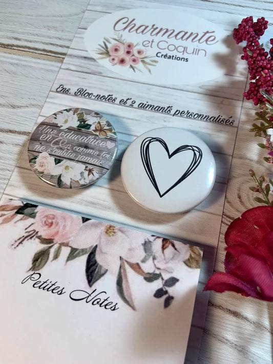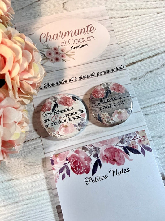 Ensemble bloc notes et 3 aimants personnalisés, cadeau pour éducatrice, cadeau remerciement éducatrice