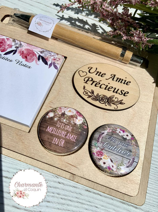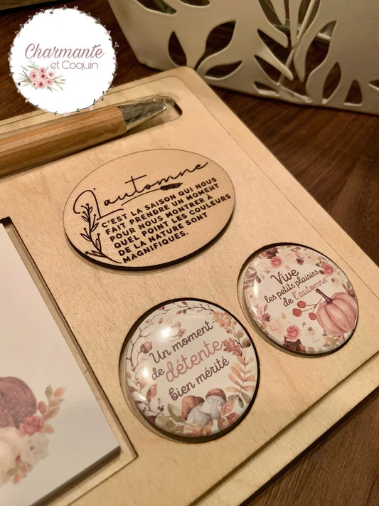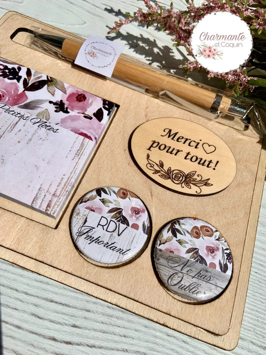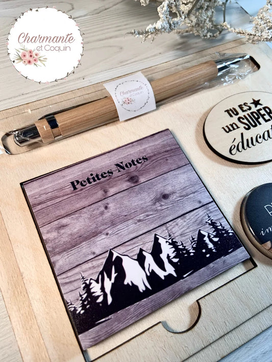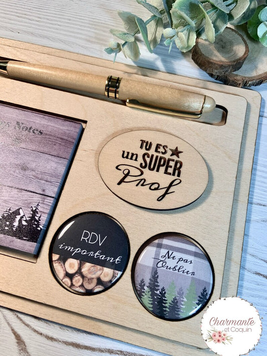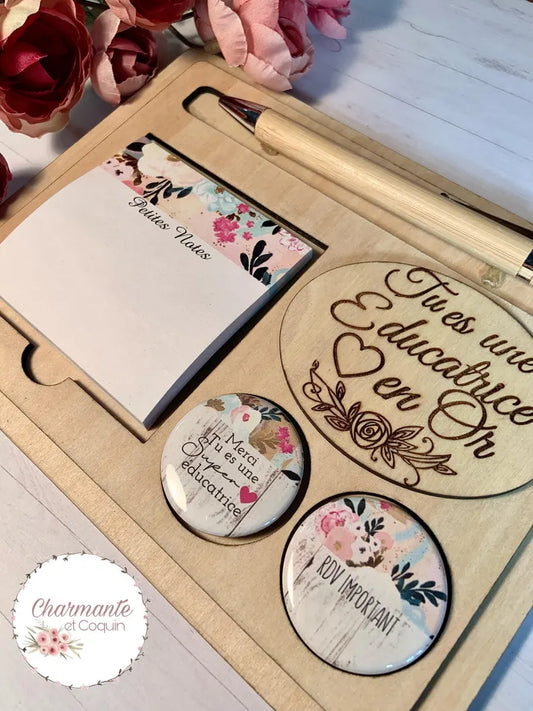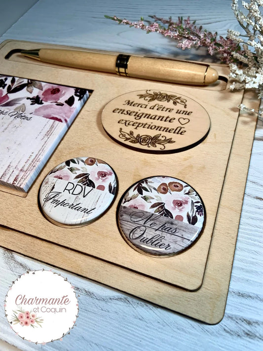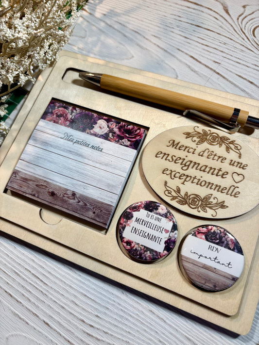 Cadeau pour éducatrice, ensemble personnalisé en bois avec bloc notes autocollants et deux ensembles d’aimants personnalisés.