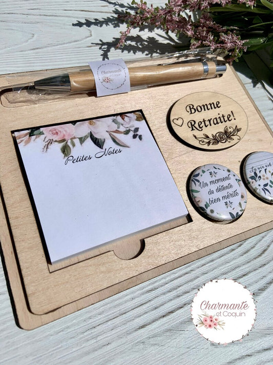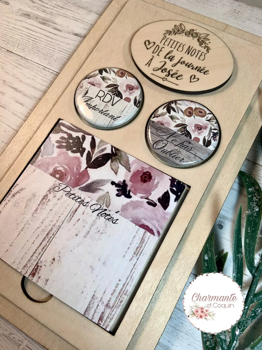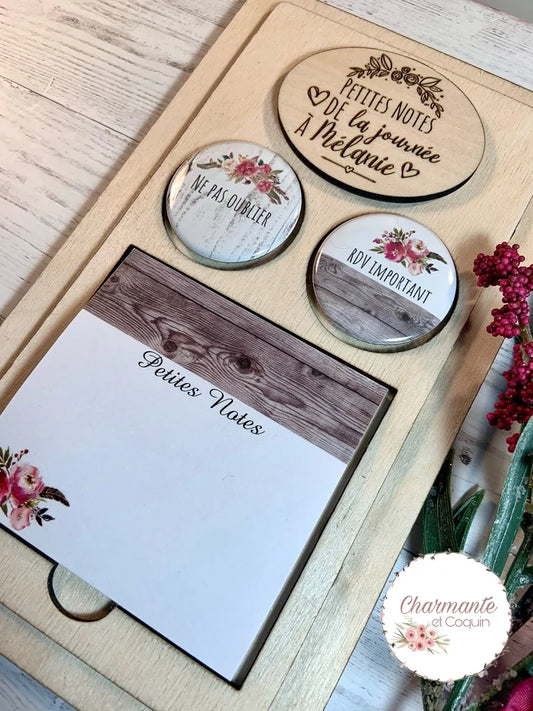 Petit ensemble personnalisé en bois avec bloc notes autocollants (style post it ) et deux ensembles d’aimants personnalisés.