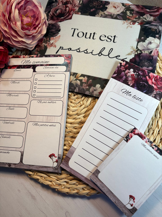 Ensemble de planification hebdomadaire avec motifs aquarelle fleurs bourgognes.