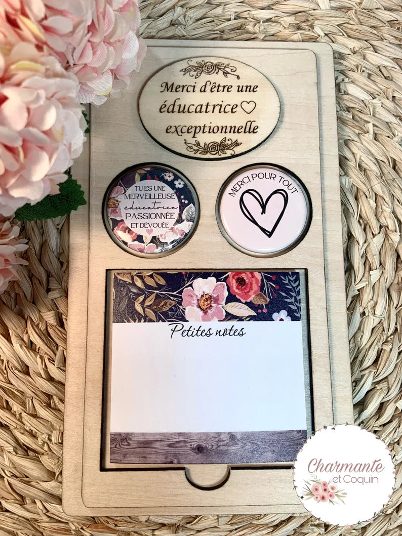 Cadeau pour éducatrice, ensemble personnalisé en bois avec bloc notes autocollants et deux ensembles d’aimants personnalisés.