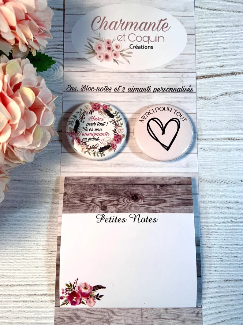 Ens. Bloc -notes avec feuilles autocollantes ( style post it) avec 2 aimants personnalisés pour enseignante, cadeau enseignante
