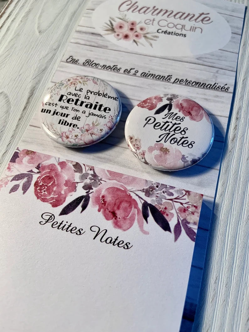 Une magnifique idée de cadeau personnalisé à offrir pour souligner la retraite d'un membre de votre famille, collège, amie etc. Ens. Bloc - note avec feuilles autocollants style post it et 2 aimants personnalisés.