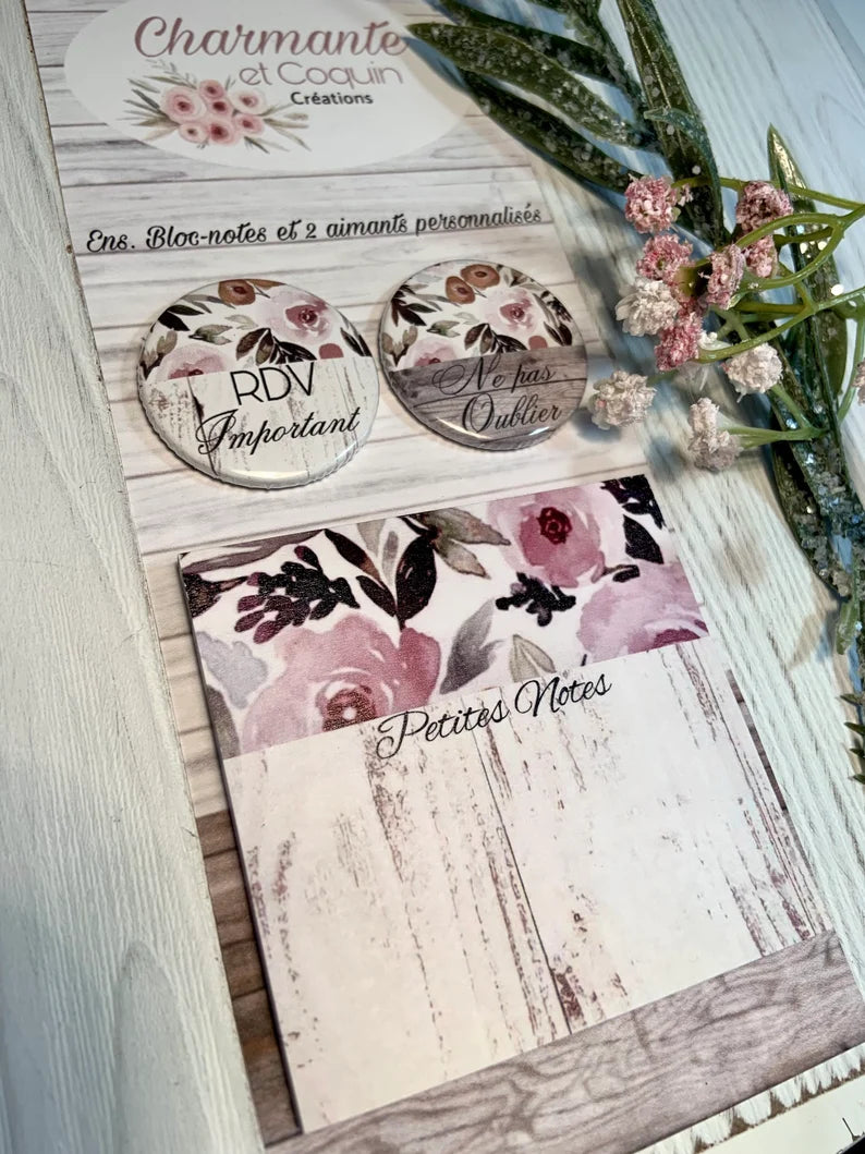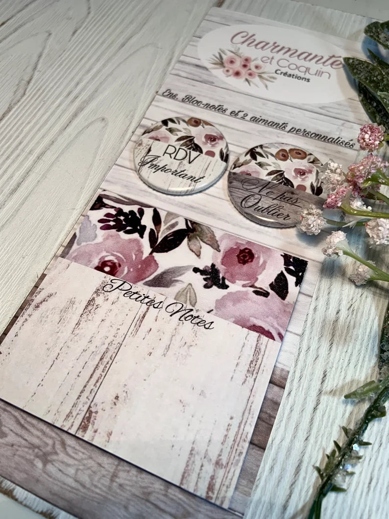 Ensemble bloc notes avec feuilles autocollantes (style post it) avec motif fleuris. Vous avez la possibilité de personnaliser les aimants avec votre choix de citations !