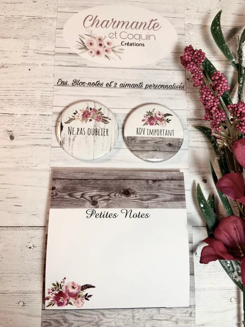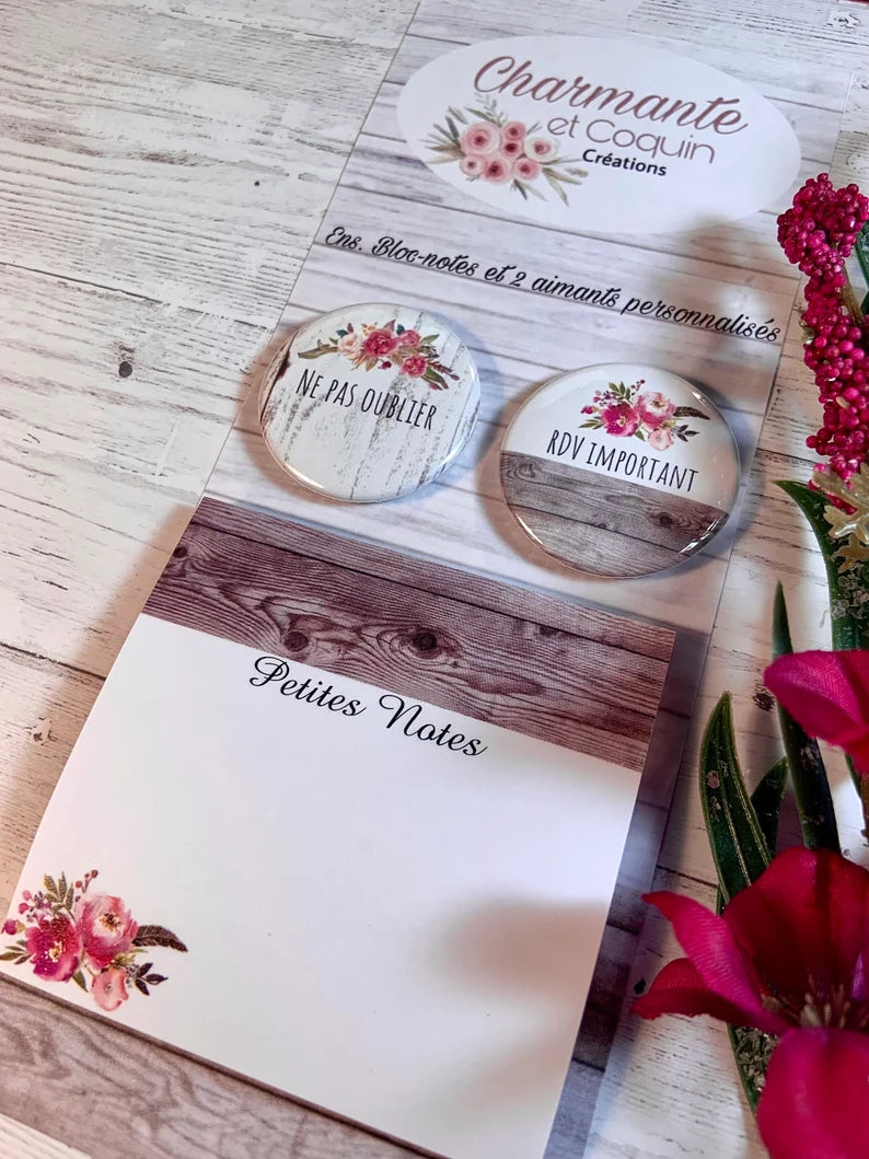 Une magnifique idée de cadeau personnalisé à offrir à un membre de votre famille, collège, amie etc. Ens. Bloc - note avec feuilles autocollants style post it et 2 aimants personnalisés.