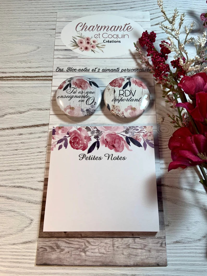Ensemble bloc notes avec feuilles autocollantes (style post it) avec motif fleuris. Vous avez la possibilité de personnaliser les aimants avec votre choix de citations !