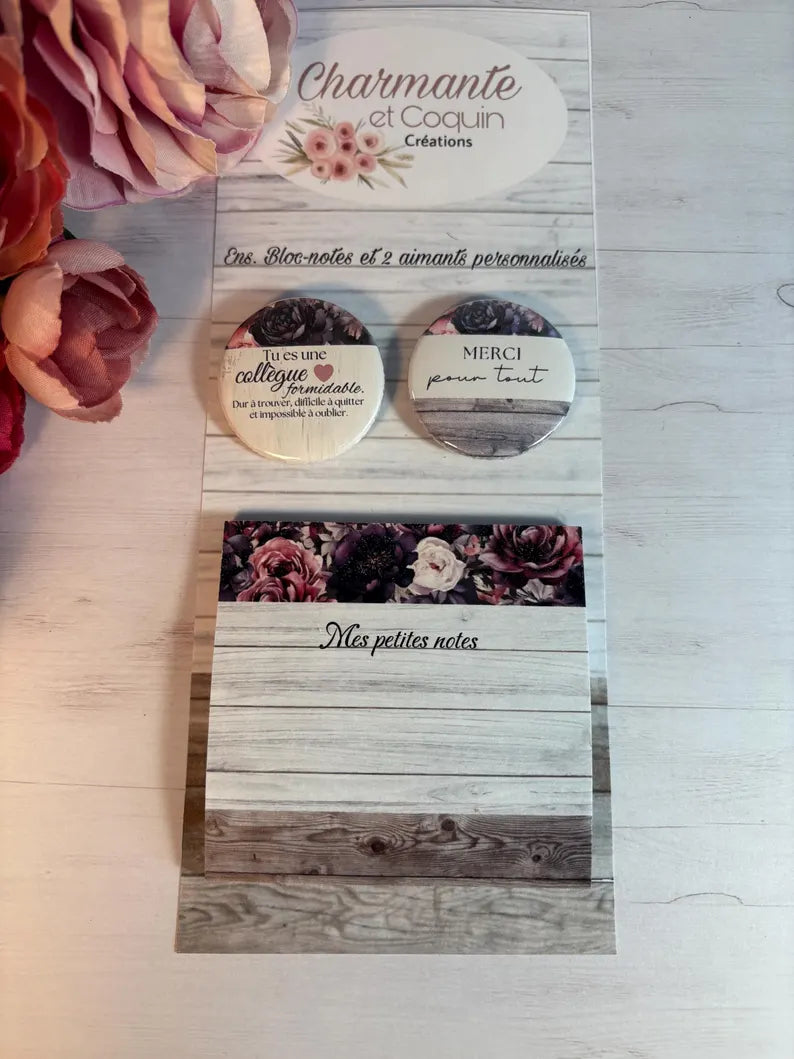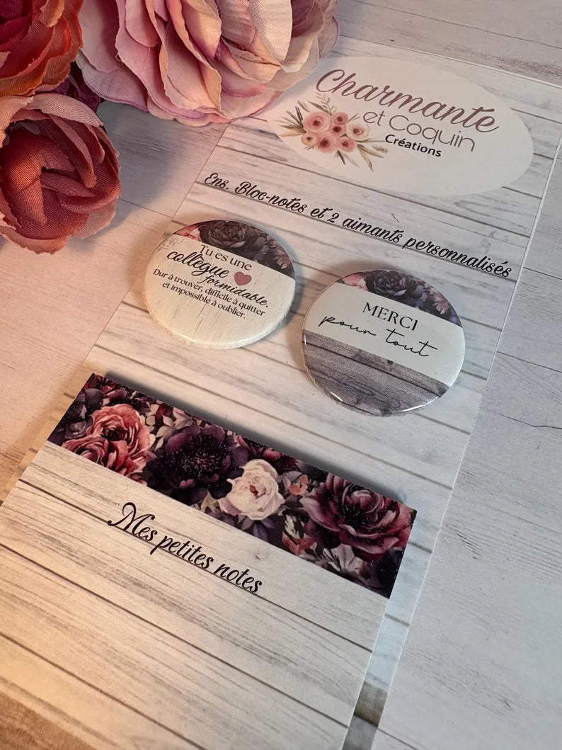 Ensemble bloc notes avec feuilles autocollantes (style post it) avec deux aimants personnalisés, cadeau pour le départ d’une collègue .