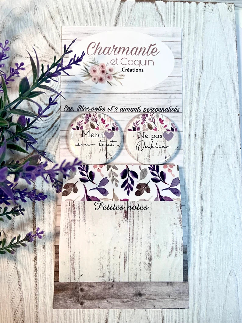 Ensemble bloc notes avec feuilles autocollantes (style post it) avec deux aimants personnalisés, cadeau remerciement