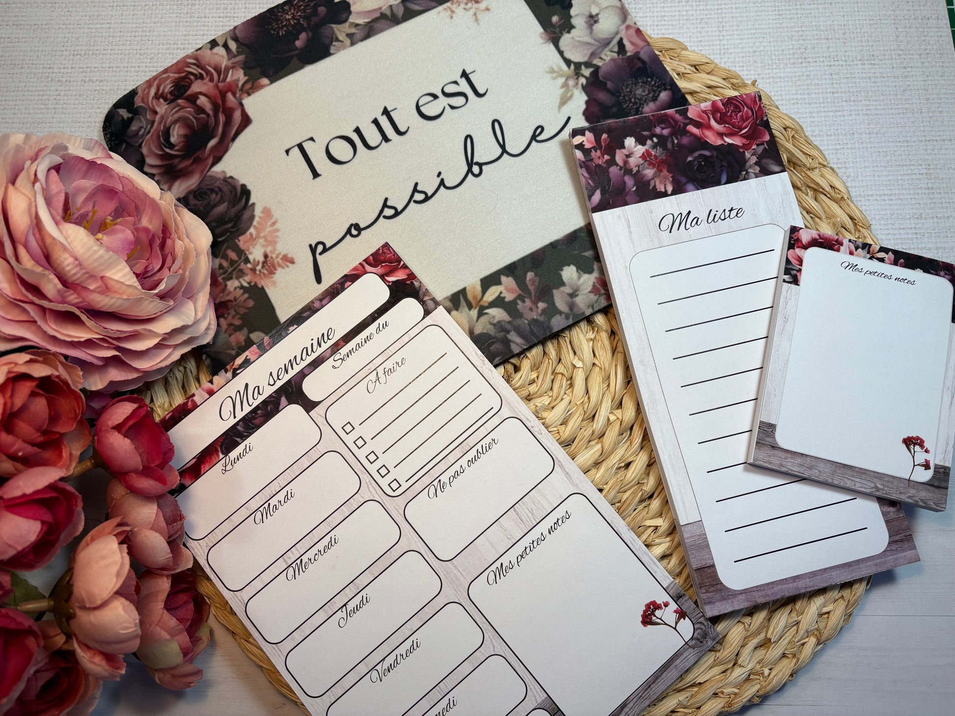 Ensemble de planification hebdomadaire avec motifs aquarelle fleurs bourgognes.