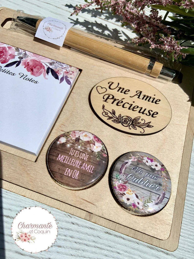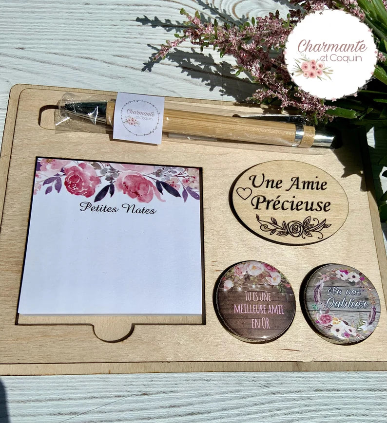 Un très bel organisateur de bureau en bois avec porte crayon , bloc notes autocollants (style post it ) et deux ensembles d'aimants personnalisés ! Une belle idée de cadeau pour une grande amie qui vous ait chère. Cela fera magnifique sur son bureau de travail mais également très pratique !! Un aimant peut également être personnalisé avec une petite citation de votre choix ! Un cadeau plus que parfait qui fera grand plaisir de recevoir.