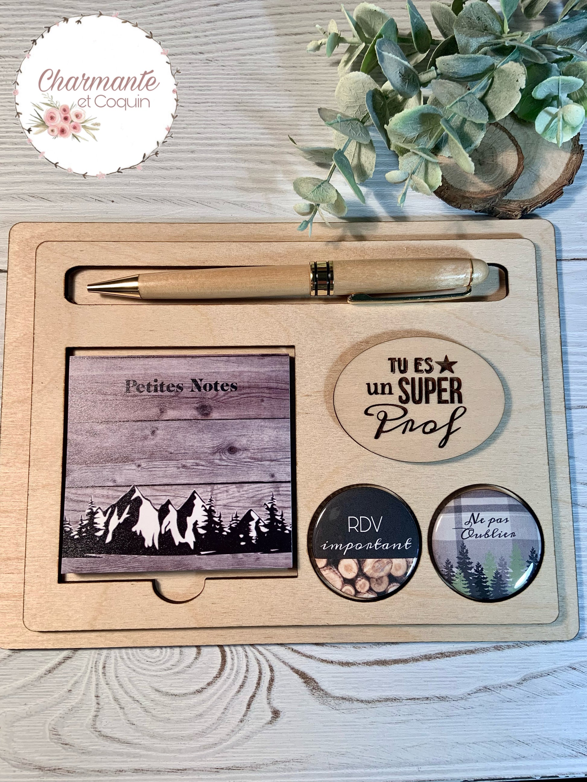 Petit organisateur de bureau en bois avec porte crayon , bloc notes autocollants (style post it ) et deux ensembles d'aimants personnalisés! Une belle idée de cadeau pour l'enseignant de votre enfant. Cela fera magnifique sur son bureau de travail mais également très pratique !! Un aimant peut également être personnalisé avec une petite citation de votre choix ! Un cadeau plus que parfait qui fera grand plaisir de recevoir.