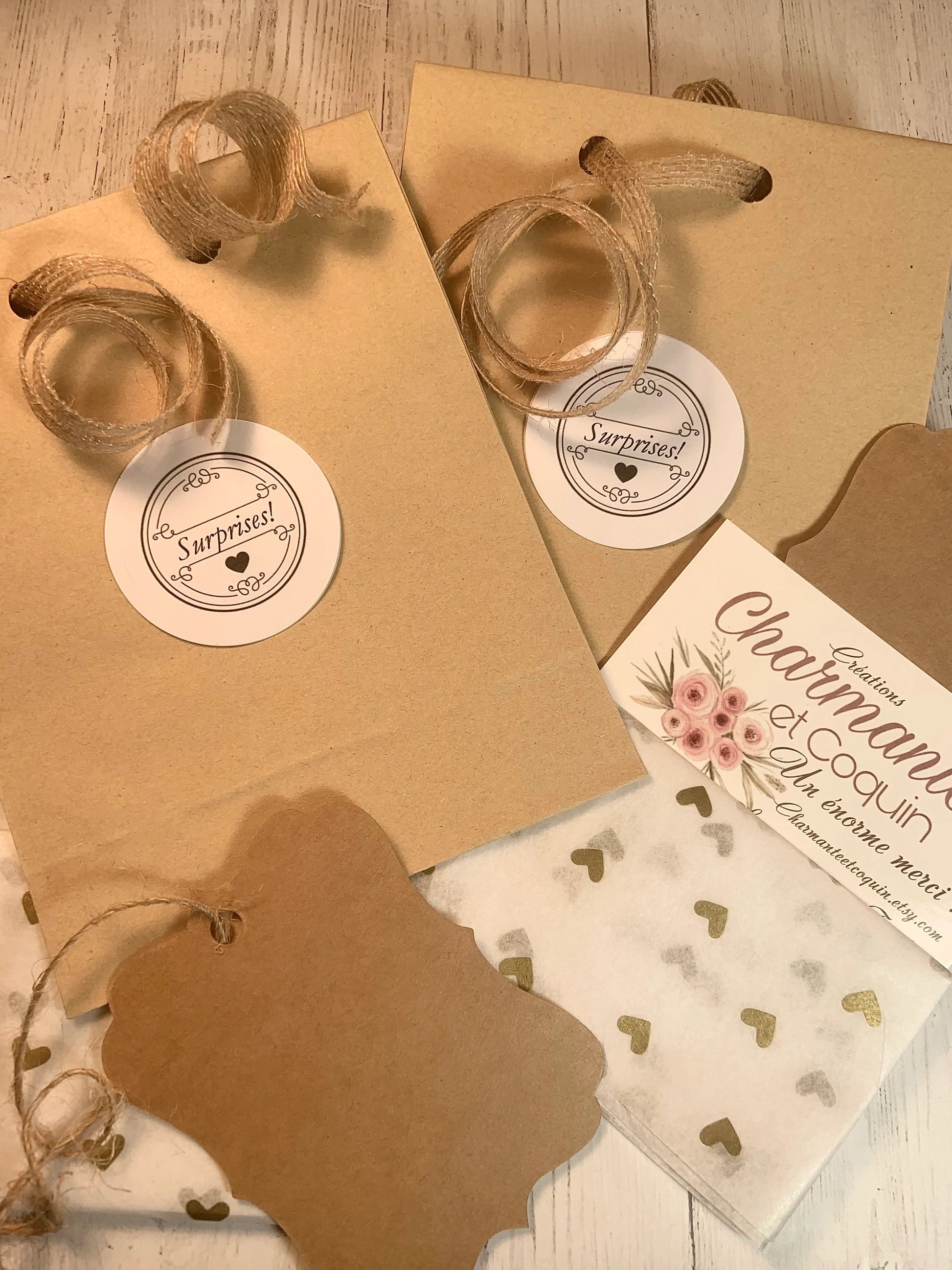 Une splendide idée qui fera une grande surprise! Charmante et Coquin vous offre en cadeau pour votre porte-clés un petit sac avec papier de soie et petite carte du moment.